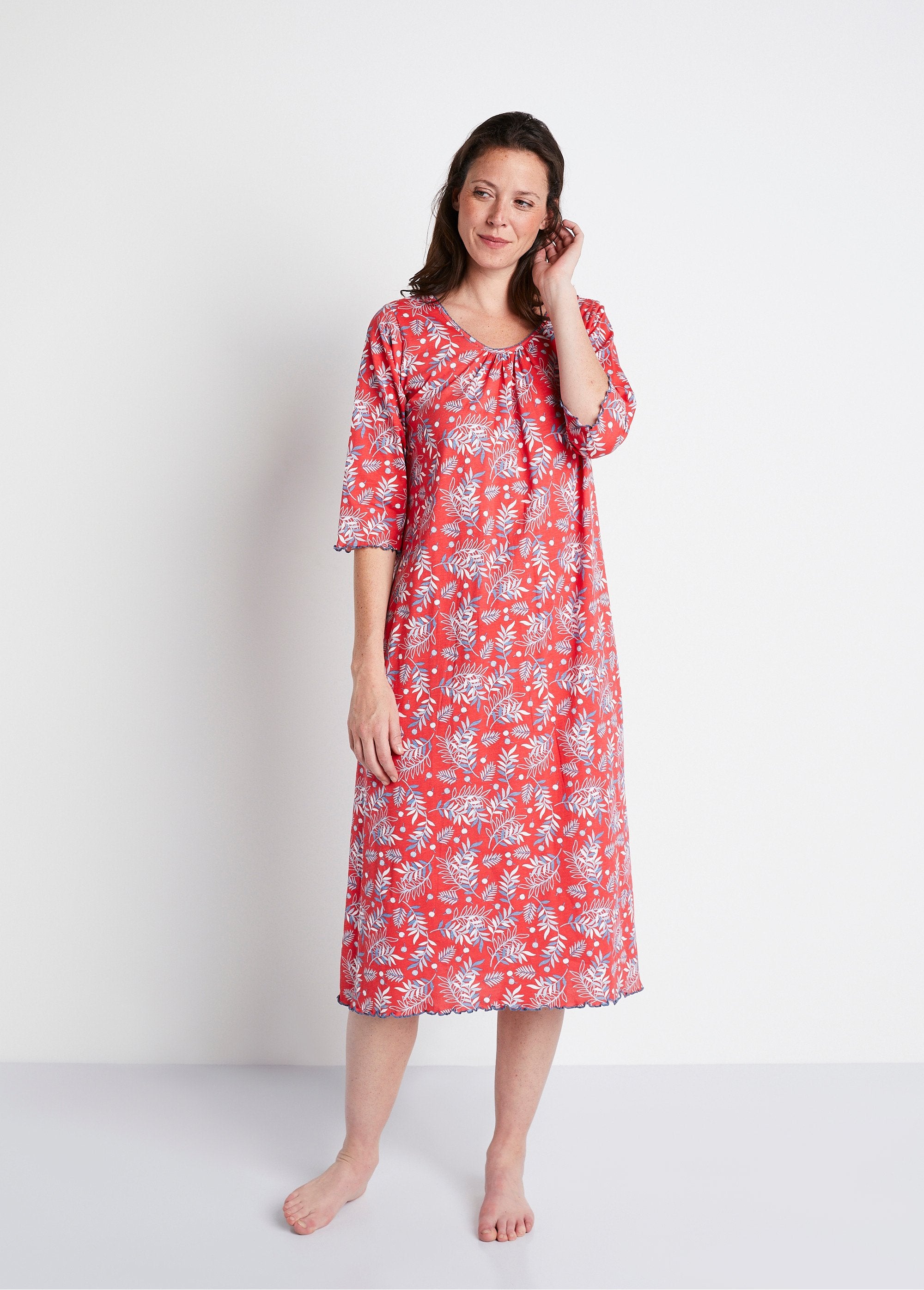 Long_3/4_sleeve_printed_cotton_nightgown_Red_background_FA1_slim Long_3/4_sleeve_printed_cotton_nightgown_Red_background_DO1_slim