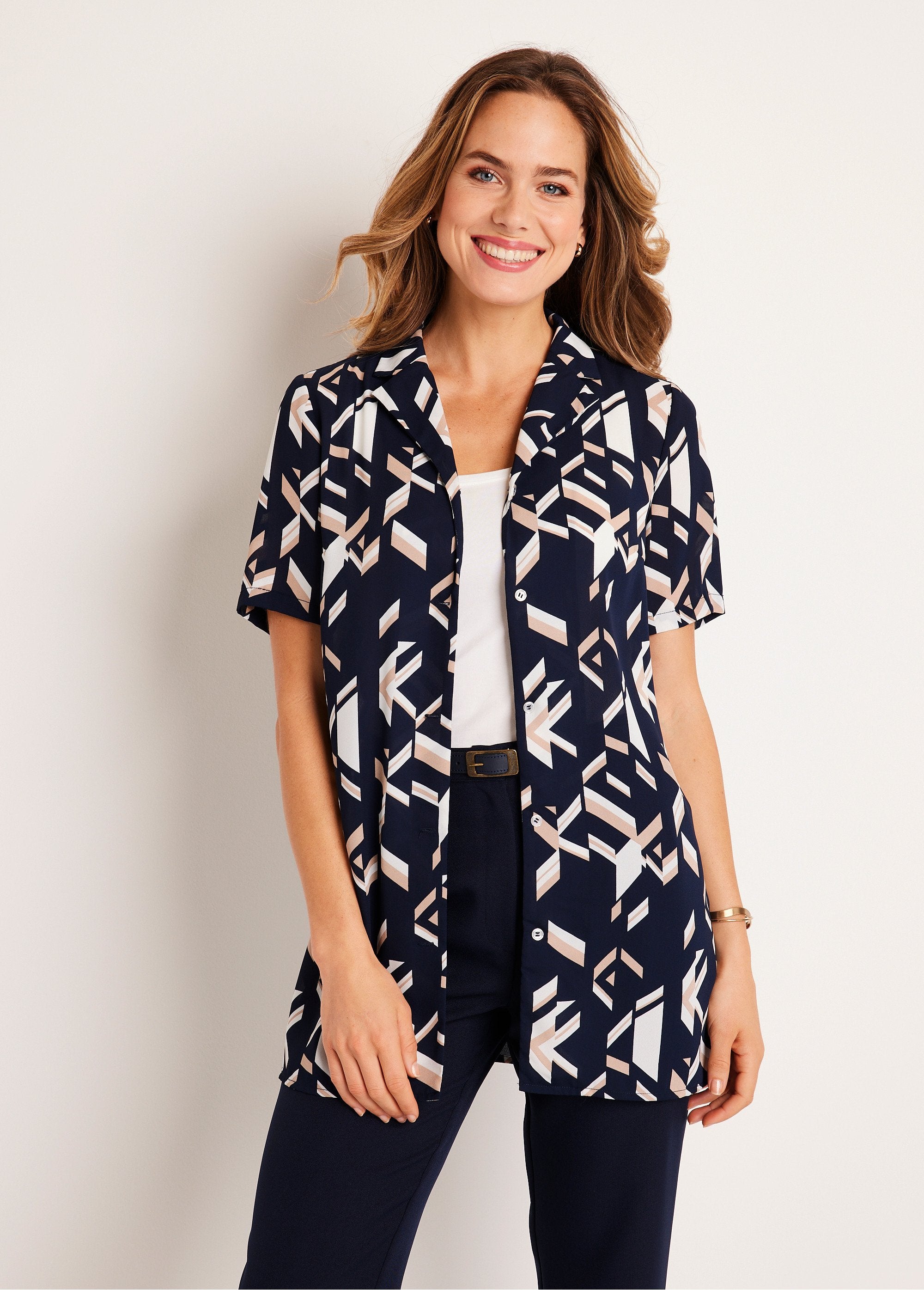 Graphic chic noted for this short-sleeved tunic, perfect to accompany skirts and plain pants. Long line, buttoned and slit on the sides. Tailored collar. Topstitched finishes.